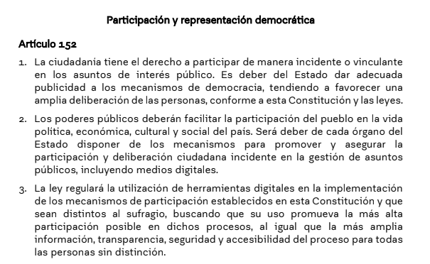 Junto con esto, en el artículo 152, se reconoce el derecho de la ciudadanía a “participar de manera incidente o vinculante en los asuntos de interés público”. Para esto el Estado tendrá el deber de publicitar los mecanismos de democracia y, además, se expresa que “los poderes públicos deberán facilitar la participación del pueblo en la vida política, económica, cultural y social del país”.